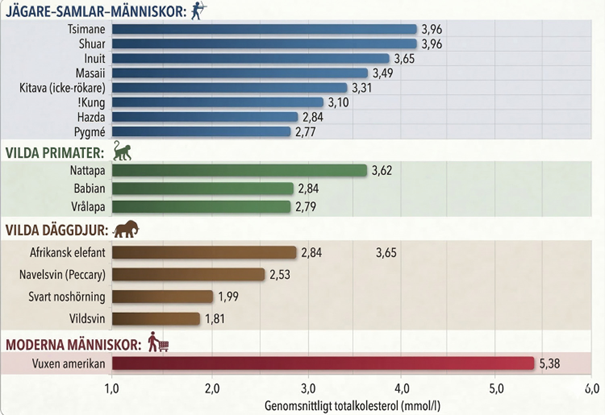 Total kolesterol hos olika samlar- och jägarfolk, olika djurarter och amerikaner på 70-talet.