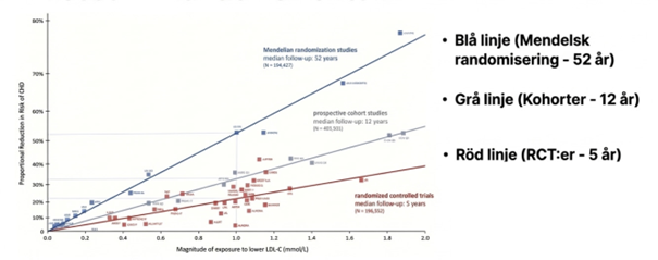 Det har kommit många RCTs på statiner av olika typ. Inte bara hos de som redan har hjärtsjukdom utan också som förebyggande medicin hos personer i ökad risk. Utöver det här så har det också kommit andra mediciner som har andra verkningsmekanismer än statiner. De sänker LDL men via andra biologiska vägar. Trots att metoden för att sänka LDL är annorlunda med de här medicinerna så ser man samma dos och tidseffekt. Ju lägre du får ner LDL desto större blir effekten och ju längre LDL är lågt desto större blir effekten.