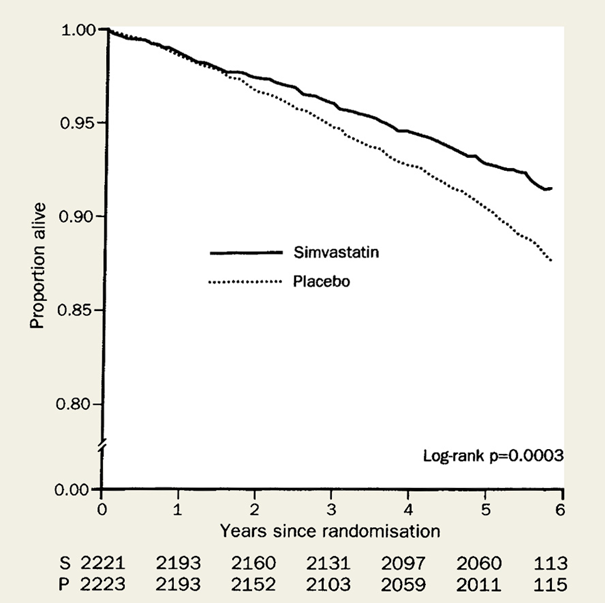 Sju år senare publicerades sen resultatet från en stor randomiserad studie utförd i skandinavien som vanligen kallas för 4S-studien. Den studien visade på det förväntade resultatet, färre fall av hjärtsjukdom. 4S-studien utfördes på 4444 män och kvinnor som redan hade hjärtsjukdom. Först kom en sänkning av LDL med 35 procent och det gav sen i sin tur en minskad risk att dö från alla orsaker med 30 procent. Orsaken till den effekten var en minskad risk för hjärt- och kärlsjukdom med 42 procent hos deltagarna som fick statiner (15).