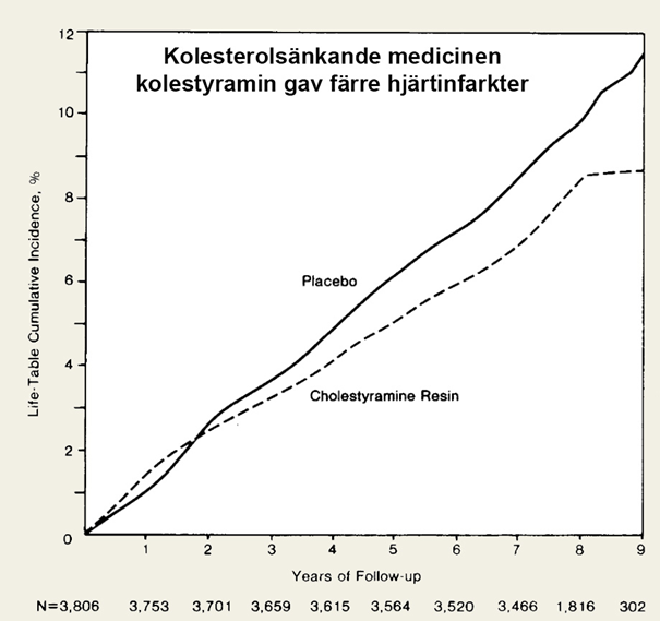 Den slutliga bevisen, spiken i kistan, när det gäller slutsatsen att LDL-kolesterol direkt orsakar hjärtsjukdom kom på 80-talet. Den första studien som fick stort genomslag publicerades 1984 (13). En medicin vid namn Kolestyramin gavs till över 3800 män som sedan följdes i 7 till 10 år. Männen var inte sjuka från start men de hade höga kolesterolvärden, de var alltså i förhöjda risk. Men de hade inte tidigare hjärtsjukdom, inget högt blodtryck, inte typ 2 diabetes eller något annat.