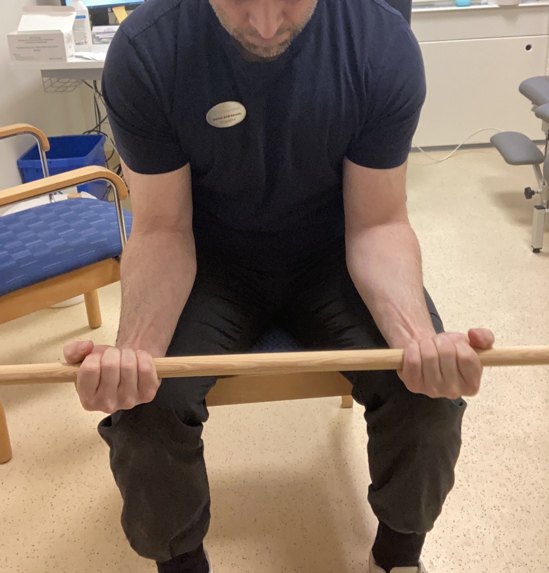 Hos vissa kan belastningen leda till en vävnadsirritation och smärta som gör det svårt att hålla och pressa vikter. Ha därför som vana att placera stången mitt i handen (se bild), med måttlig vinkling (dorsalflexion) av handleden.