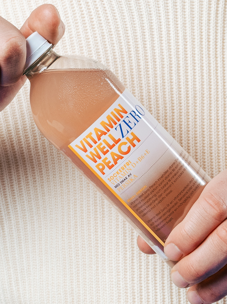 Vitamin- och mineralberikad sockerfri dryck utan kolsyra. Med smak av persika. Innehåller sötningsmedel. Vitamin Well Zero Peach innehåller vitamin D som bidrar till normal muskelfunktion samt vitamin B6 som stödjer normal proteinomsättning och bidrar till minskad trötthet och utmattning. Vidare innehåller den vitamin E som bidrar till att skydda cellerna mot oxidativ stress.