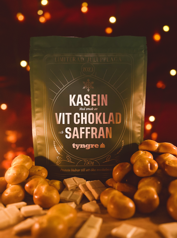 Årets julsmak är äntligen här: Kasein Vit Choklad/Saffran! Sötman från den vita chokladen gifter sig sömlöst med saffranstonerna och skapar bjällerklang som ljuder hela vägen till dopparedagen!